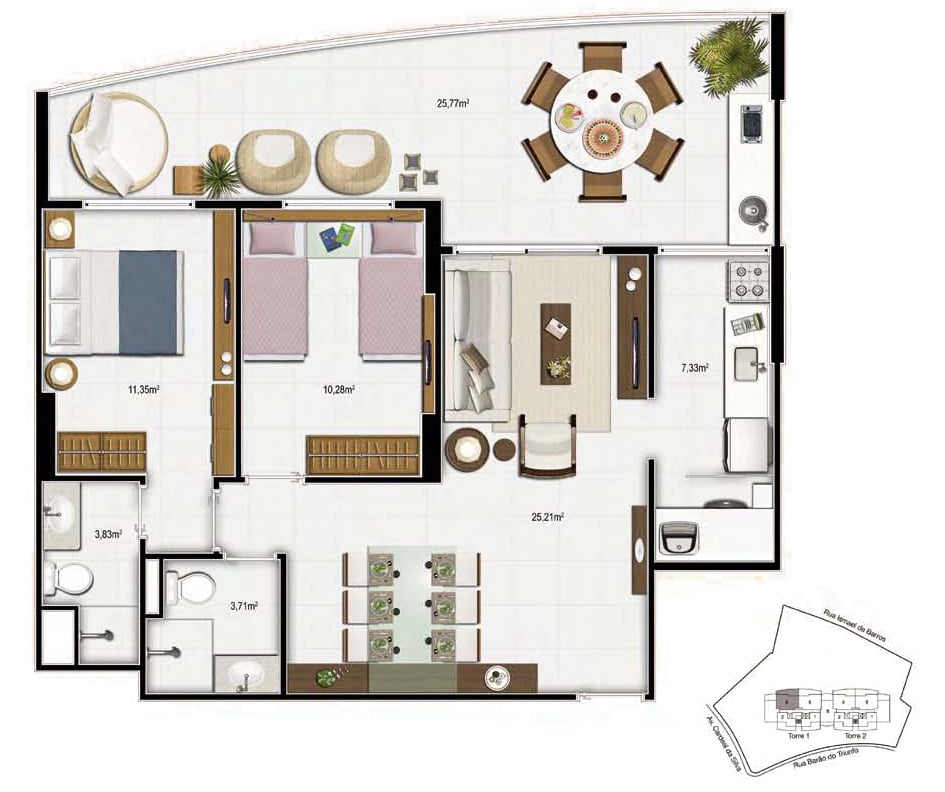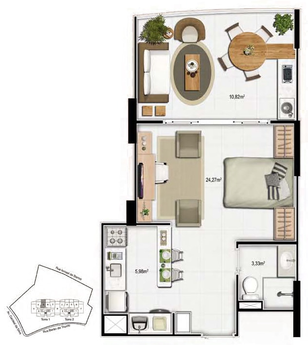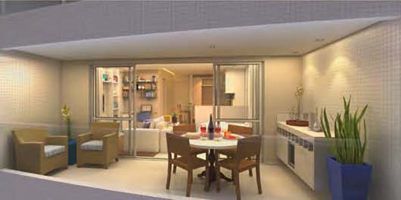 - Tipo Comfort II: quarto c/ suíte e varanda, sala e varanda gourmet;