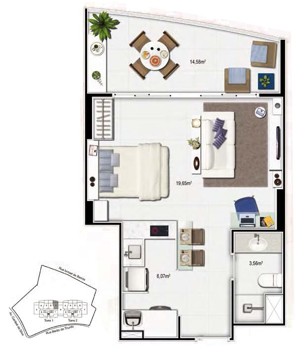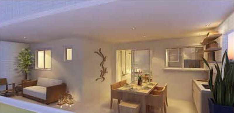 - Tipo Comfort I: quarto c/ suíte, sala e varanda gourmet;