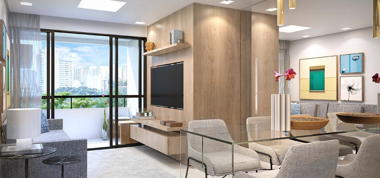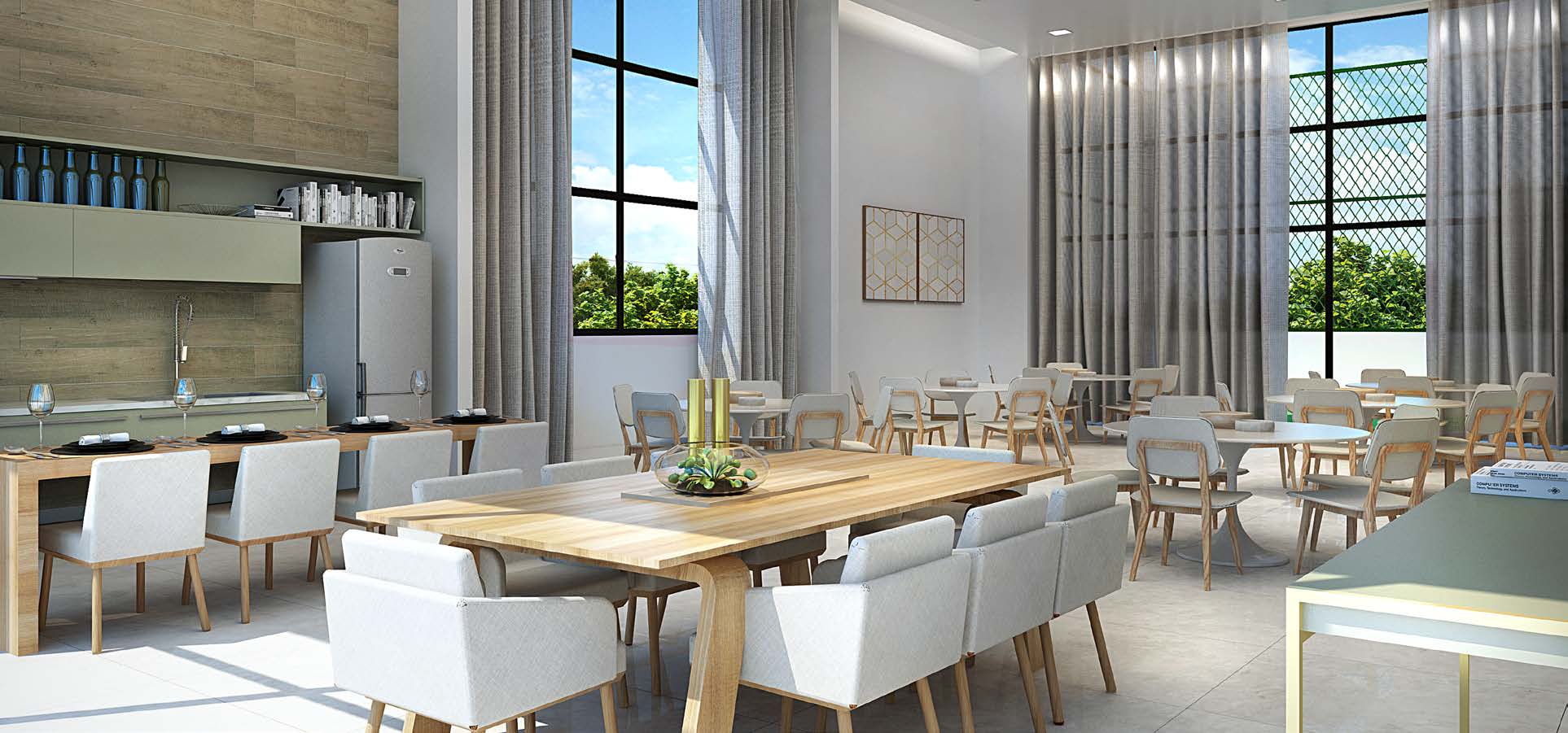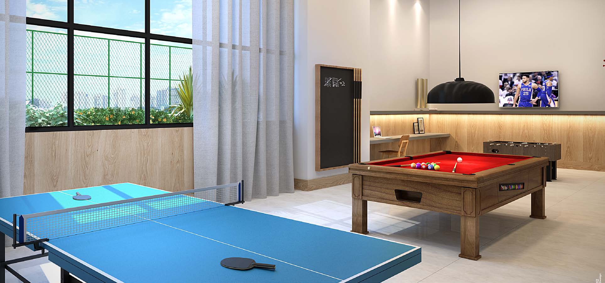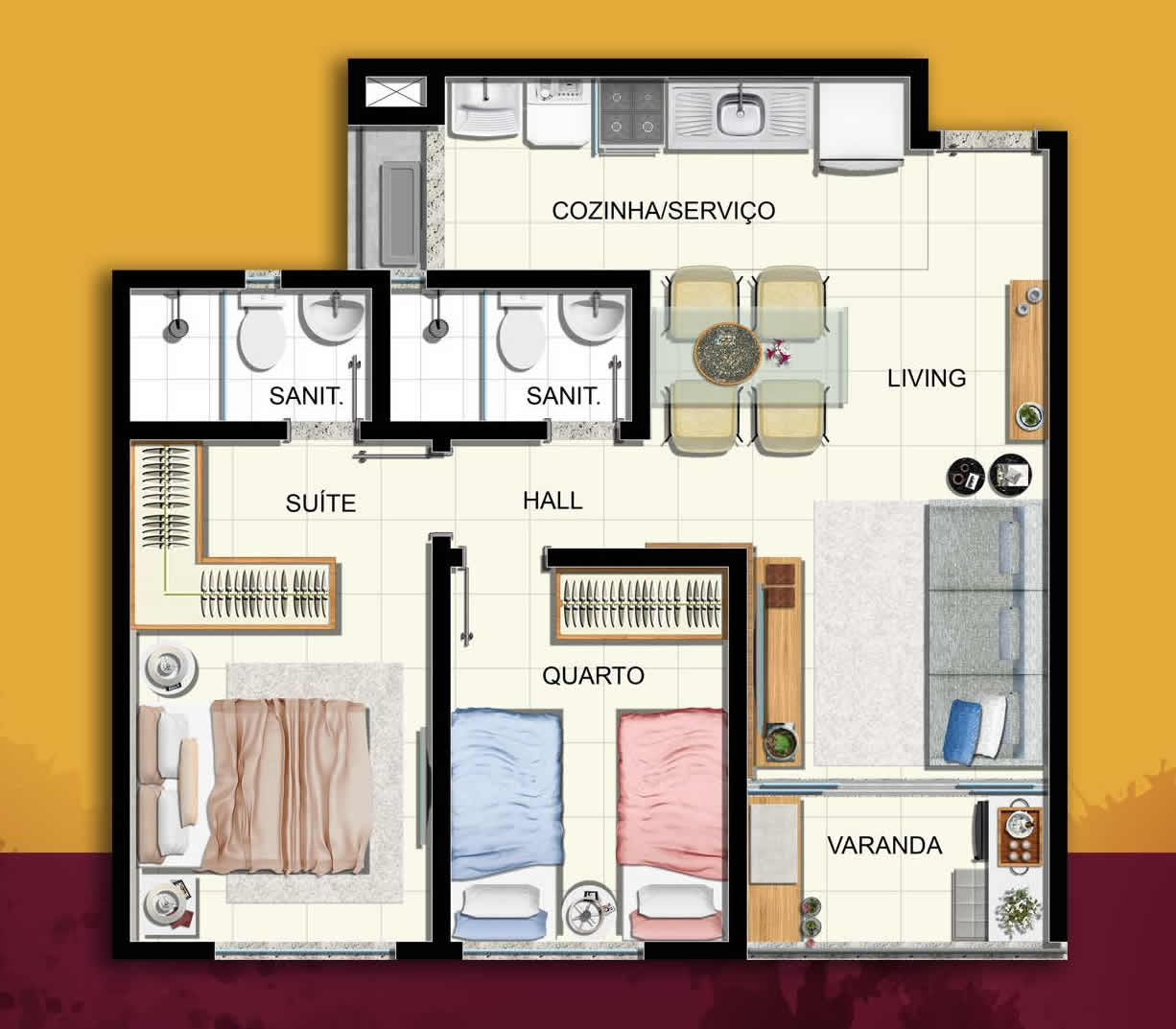 Living, varanda, 02 (dois) quartos sendo um suíte, sanitário social, hall, cozinha, área de serviço e área técnica com área privativa de 53.81m2.