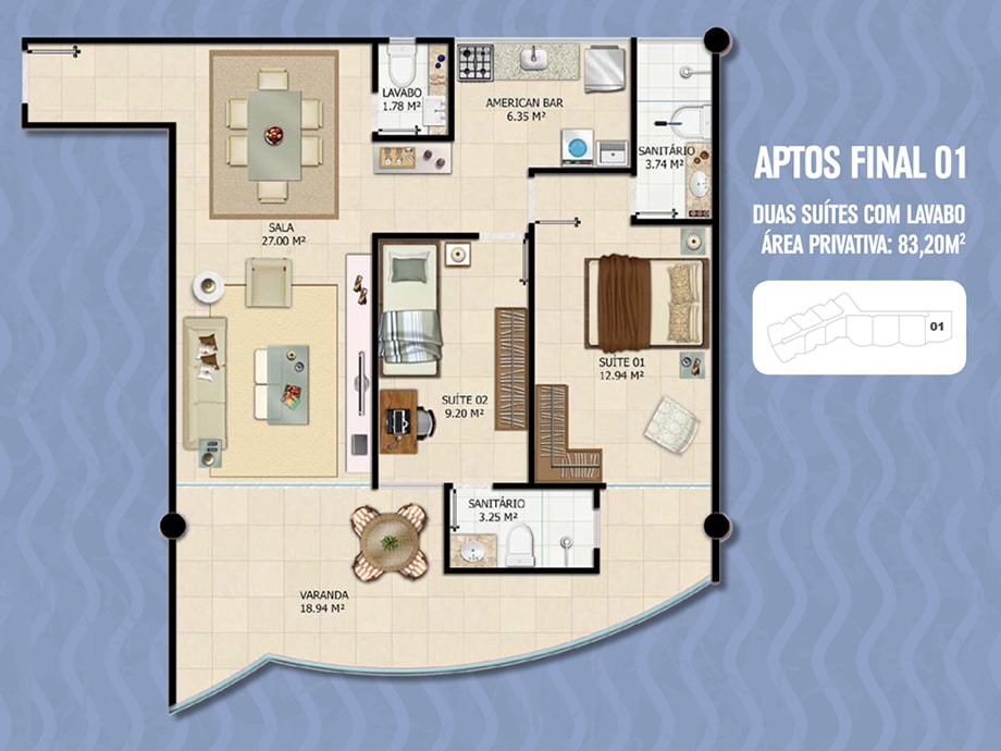 | Final 01 – Duas suítes com lavabo | 2 | 2 | 2 | 83,20m² |