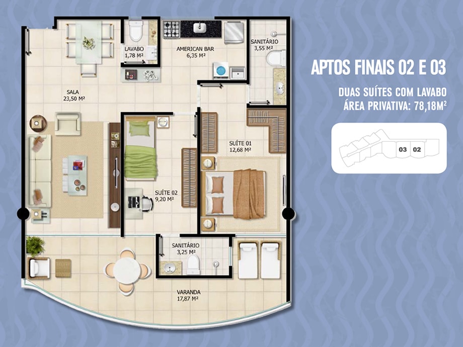 | Final 03 – Duas suítes com lavabo | 2 | 2 | 2 | 78,18m² |