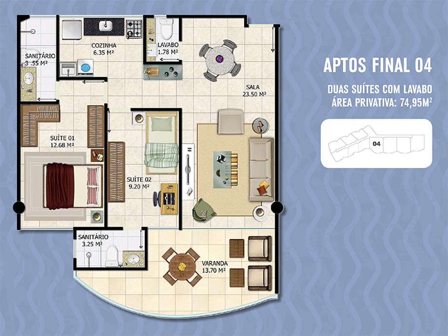 | Final 04 – Duas suítes com lavabo | 2 | 2 | 2 | 74,95m² |