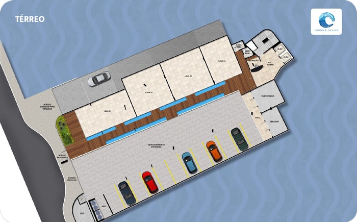 - Pavimento térreo com 4 lojas, 12 vagas para clientes das lojas, guarita e hall nobre.