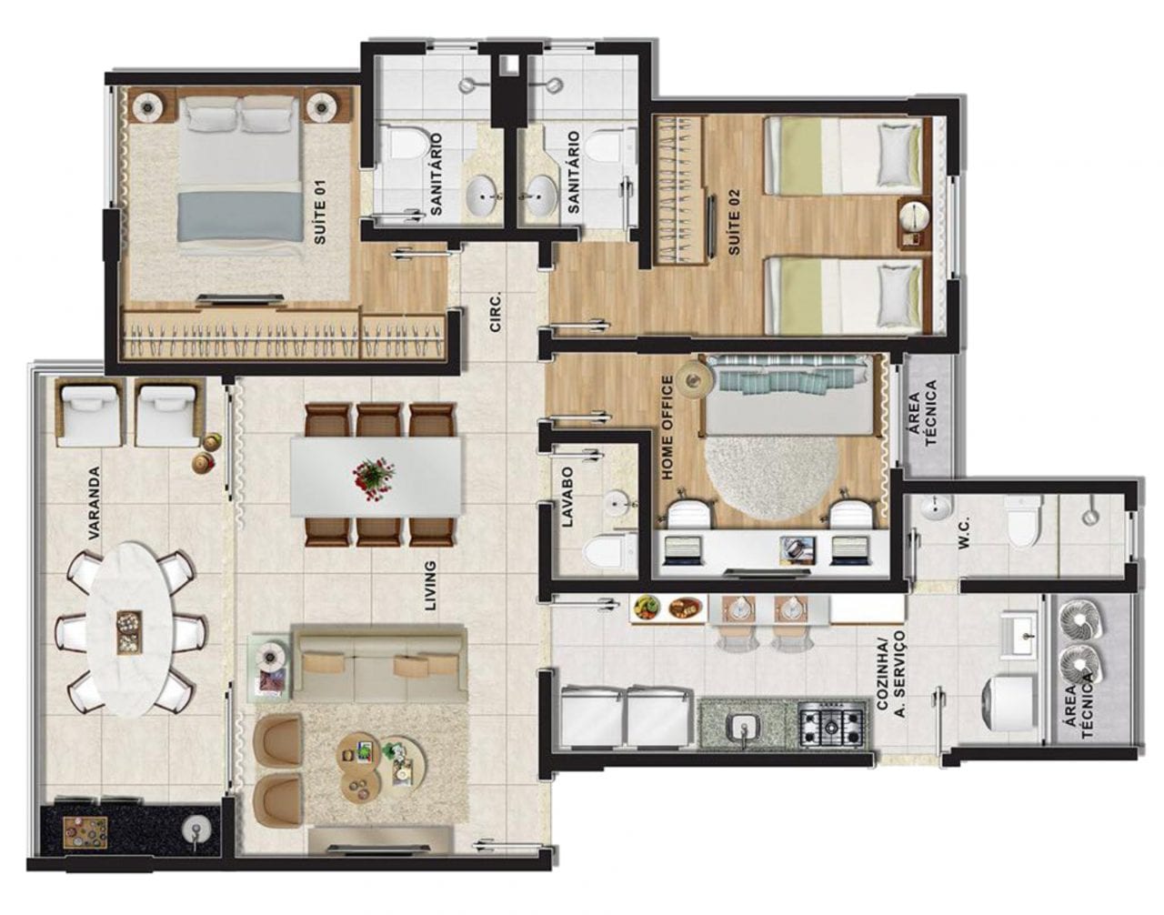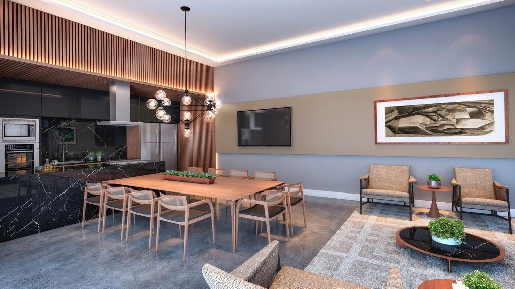 • 3 quartos (2 suítes) com home office e lavabo 95,64 m²;