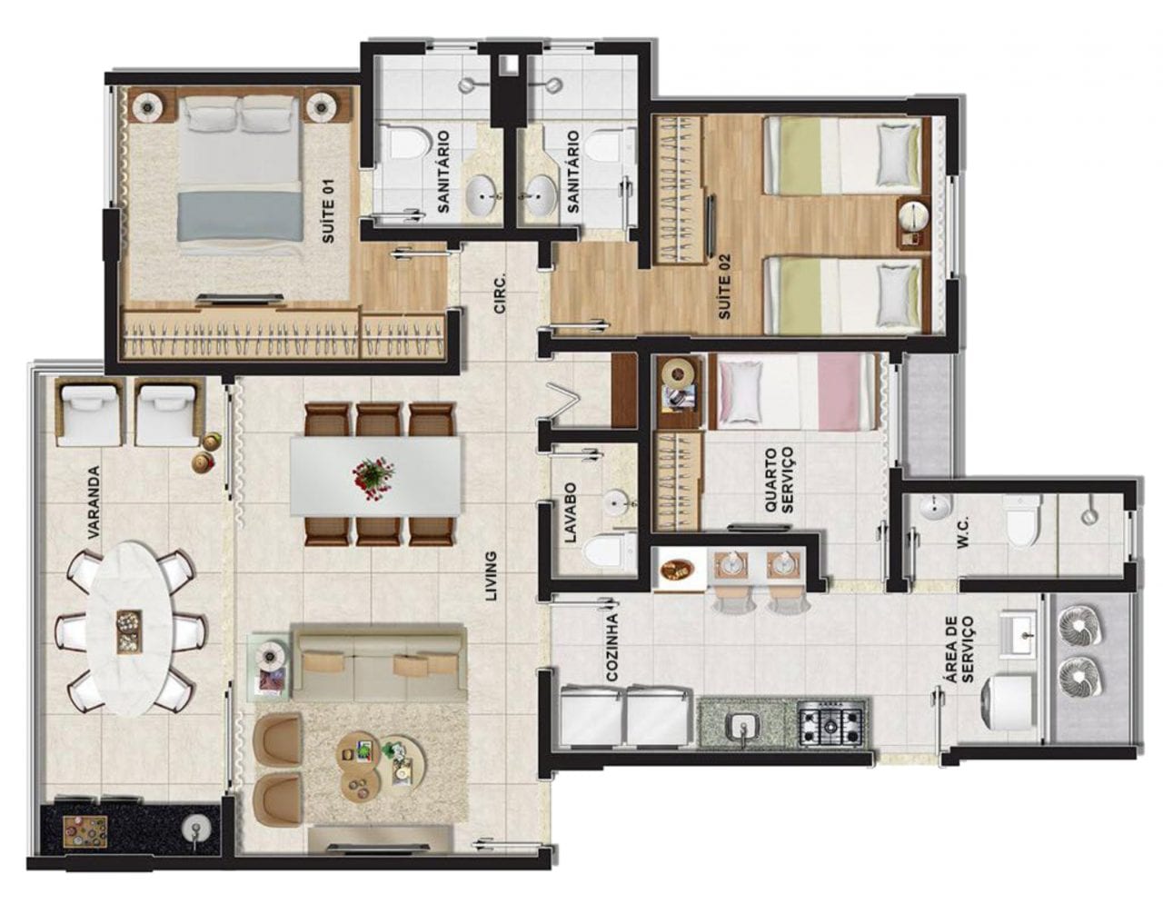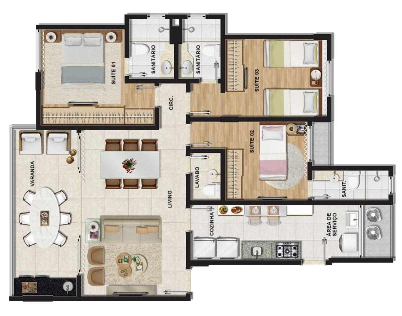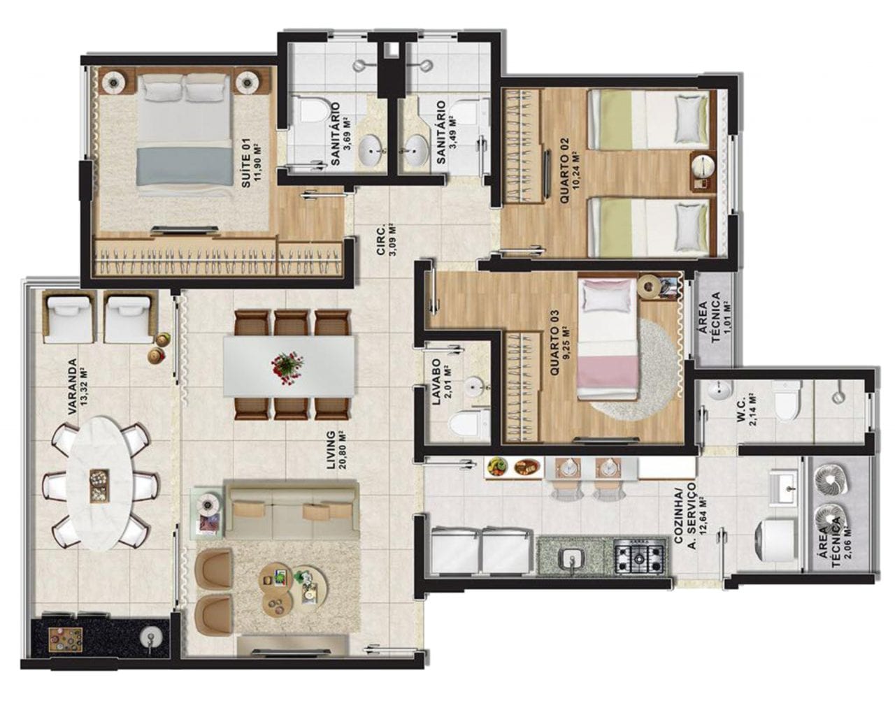 • 3 quartos (3 suítes) com lavabo 95,64 m²;