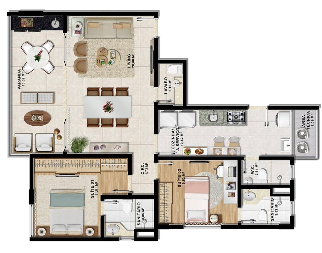 | 2 quartos | 2 | 2 | 1 | 95,64 m² |